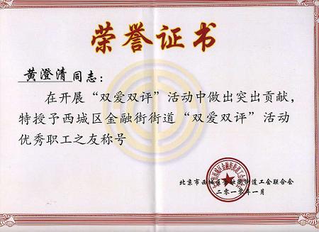 中國互聯(lián)網(wǎng)協(xié)會被北京市西城區(qū)金融街街道工會評為西城區(qū)金融街街道2009年度“雙愛雙評”活動先進單位,并頒發(fā)獎牌;同時授予我會黃澄清副理事長西城區(qū)金融街街道2009年度“雙愛雙評”活動優(yōu)秀職工之友稱號,并頒發(fā)榮譽證書。