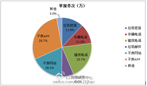 中國互聯網協會12321網絡不良與垃圾信息舉報受理中心作為公眾舉報機構,過去的一年中(2015年3月1日至2016年2月29日),共收到網民舉報203.16萬件次,其中不良APP舉報58.24萬件次,垃圾短信24.21萬件次,詐騙電話22.34萬件次,騷擾電話42.13萬件次,垃圾郵件13.35萬件次,不良網站舉報36.81萬件次,其他舉報6.08萬件次。