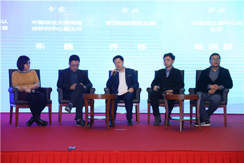 對話環節,中國信息通信研究院泰爾認證研究所社會責任項目主管常琳、中國政法大學傳播法研究中心副主任朱巍與字節跳動高級總監喬棟、58集團公益中心副主任楊洪躍、第一視頻集團副總裁孔德偉共同圍繞履行社會責任展開了對話。